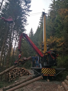 Peter Masser: Wir bieten die gesamte Palette der vollmechanisierten Holzernte vom Harvestergelände bis zum Seilkrangelände von der Erstdurchforstung bis zur Endnutzung an. Wir verfügen über Mini-Königstiger für Durchforstungseinsätze, über Königstiger für Endnutzungen, sowie den dazugehörigen Forwardern und neuerdings über einen weiteren Seilkran mit Prozessor MOUNTY 4000. Unser Einsatzgebiet erstreckt sich dabei über gesamt Österreich und ist im Katastrophenfall auch in den Nachbarstaaten Deutschland, Schweiz, Slowenien und Italien.